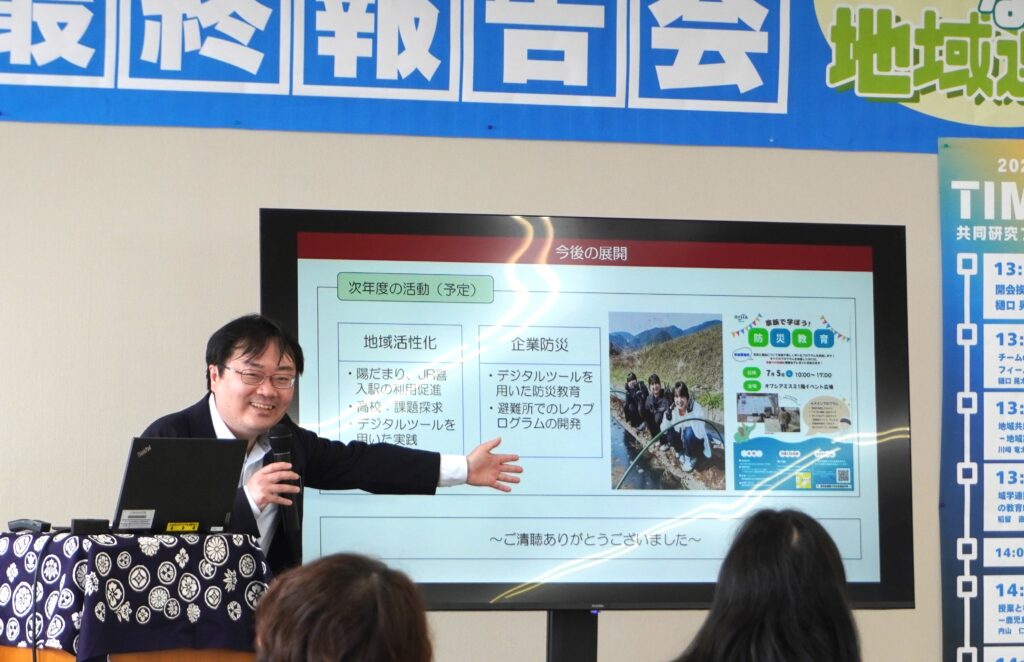特に人口減少地域の雇用確保の手法として注目される「マルチワーク(特定地域づくり事業)」について、与論島でのインタビュー調査を行い、複数の仕事を組み合わせる働き方が地域の人材定着に与える可能性を検討した。また、鹿児島市喜入町の地域交流拠点「旧麓交流館 陽だまり」をフィールドとして、学生とともに地域調査やイベント支援、SNSによる情報発信などに取り組んでいる。若い世代による情報発信を通じて、地域外への認知が徐々に広がりつつあることが確認された。さらに、商業施設オプシアミスミと連携した防災イベントの企画など、企業と大学が協働した地域防災の取り組みも紹介された。